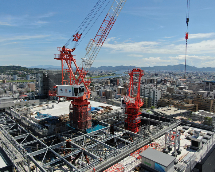 これまでより小さい130tのクレーンを使って大きなクレーンを解体します。